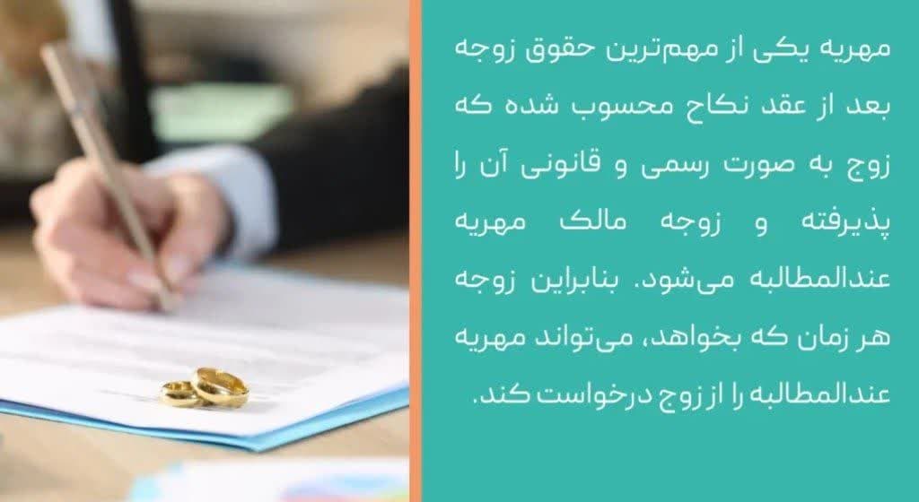 با وقوع عقد نکاح، زن مالک مهریه شده و می‌تواند آن را مطالبه نماید. مهریه به عنوان یک دین تا زمانی که پرداخت نشود بر گردن زوج قرار دارد. بنابراین، حتی امکان مطالبه مهریه پس از فوت شوهر نیز وجود دارد. تنها در صورتی که زوجه تمام یا قسمتی از مهریه خود را ببخشد، این دین از ذمه شوهر ابراء خواهد شد.